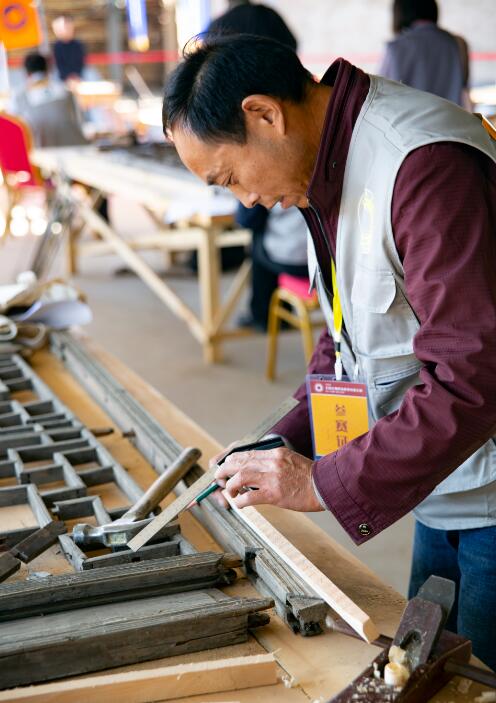 邹富成师傅在修复过程中反复观察门窗所残损部位,多次修改修复方案。在制作木构件过程中也是反复修改,邹师傅沉着应对,最终圆满地完成了对门窗的修复,展示了山西古建集团高超的技艺水平,在百余名参赛选手中获得优异成绩。