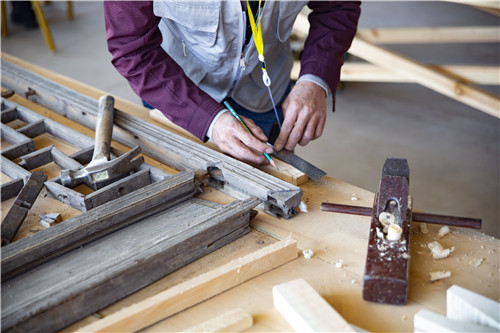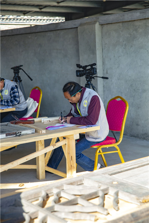 木构修复比赛中,所选修复构件为旧门窗。笔试主要考核选手是否能够准确地识别木构件的名称、材质,以及对残损状况的描述,并根据残损状况编写修复方案,绘制草图,并在规定的时间里完成修复。